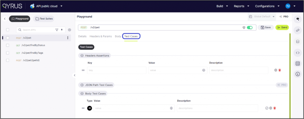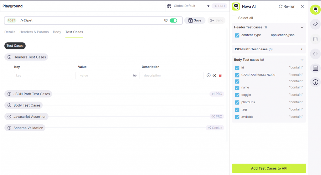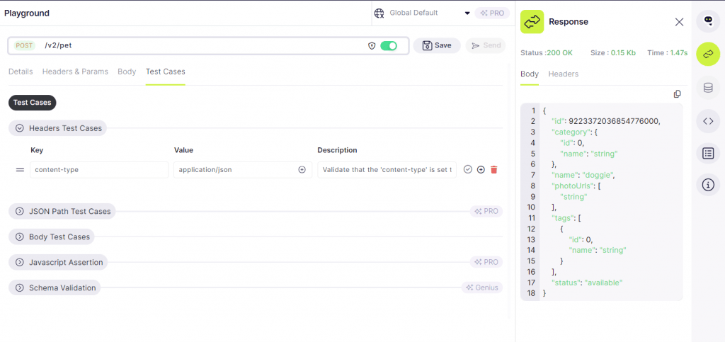 On the Test Cases tab, users are presented with options to define test cases for headers assertions, and the body of the API request or response. This functionality allows for thorough testing and validation of various aspects of the API’s behavior, ensuring reliability and consistency in its performance.