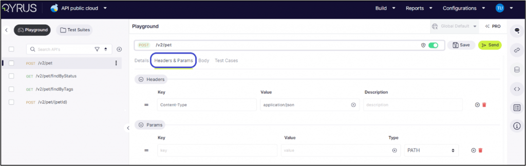 In the Headers and Params tab, users can add, delete, and modify both the key and value, as well as the type of each parameter. This functionality allows for precise customization and configuration of API requests, ensuring accurate and effective testing.