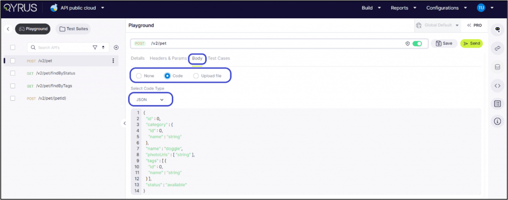 Within the Body tab, users have two options for inputting data. They can opt to either enter the code directly or upload a file.