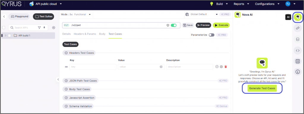 The Test Cases tab, users need to manually define test cases for headers assertions, and the body of the API request or response. This functionality allows for thorough testing and validation of various aspects of the API’s behavior, ensuring reliability and consistency in its performance.