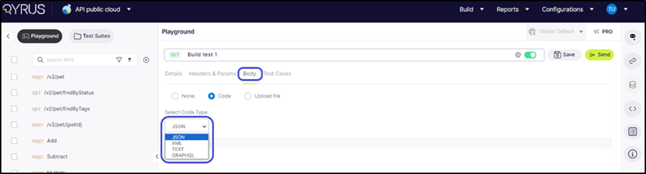 When selecting the code option, users can specify the type of code they input, including JSON, XML, Text, or GraphQL.