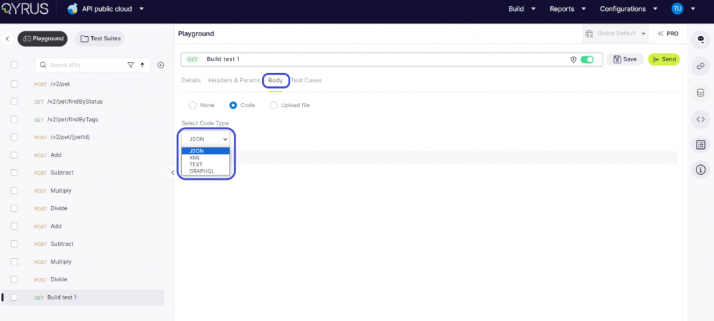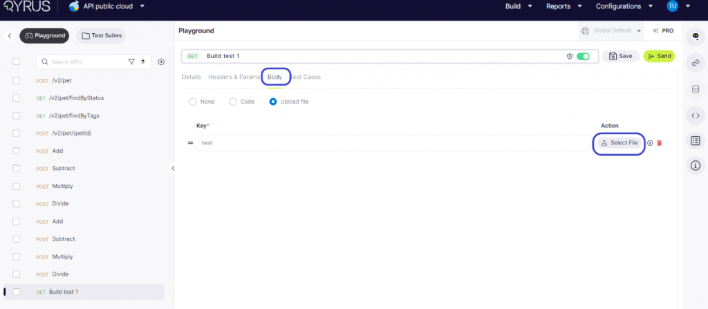 Within the Body tab, users have two options for inputting data. They can opt to either enter the code directly or upload a file.