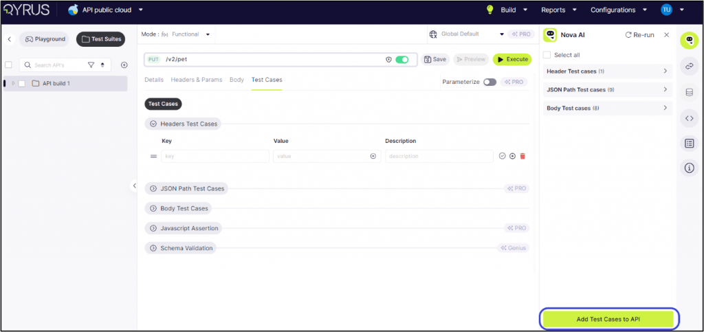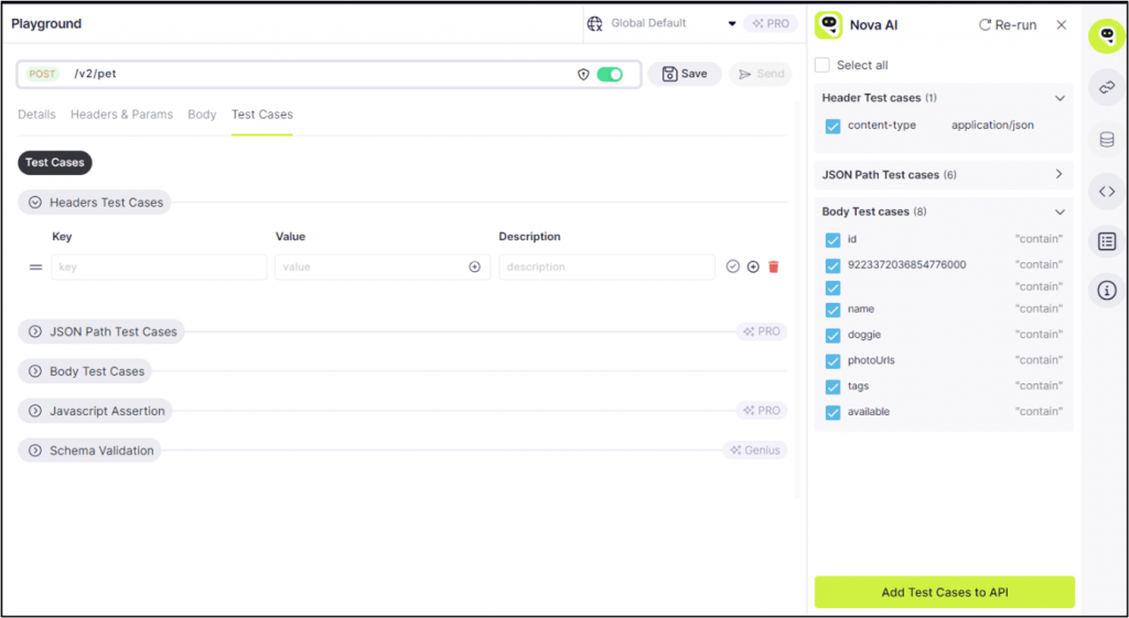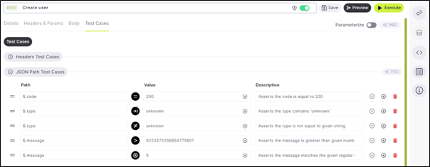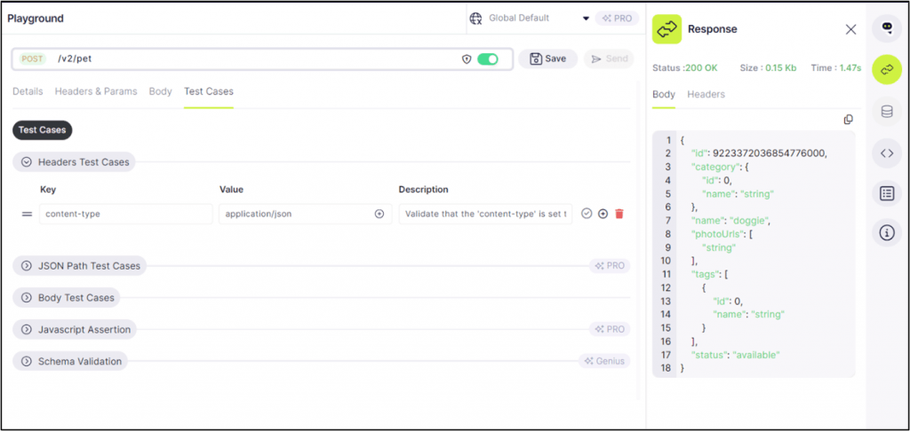 On the Test Cases tab, users are presented with options to define test cases for headers assertions, and the body of the API request or response. This functionality allows for thorough testing and validation of various aspects of the API’s behavior, ensuring reliability and consistency in its performance.