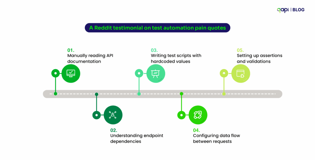 A Reddit testimonial on test automation pain quotes: “Lately, I’ve been finding test script creation and maintenance for API testing pretty time-consuming and honestly, a bit frustrating”. (Reddit)