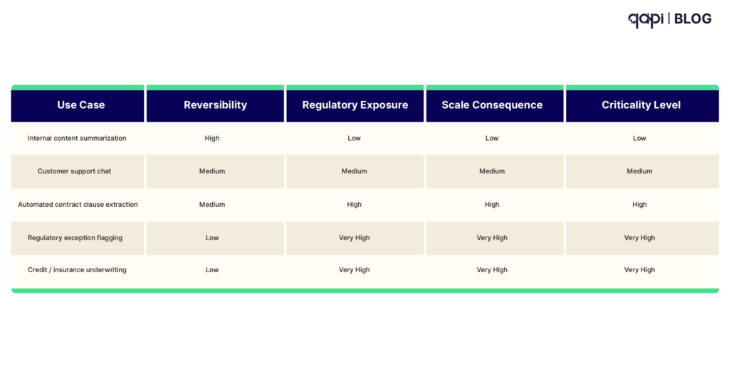 | Use Case | Reversibility | Regulatory Exposure | Scale Consequence | Criticality Level |