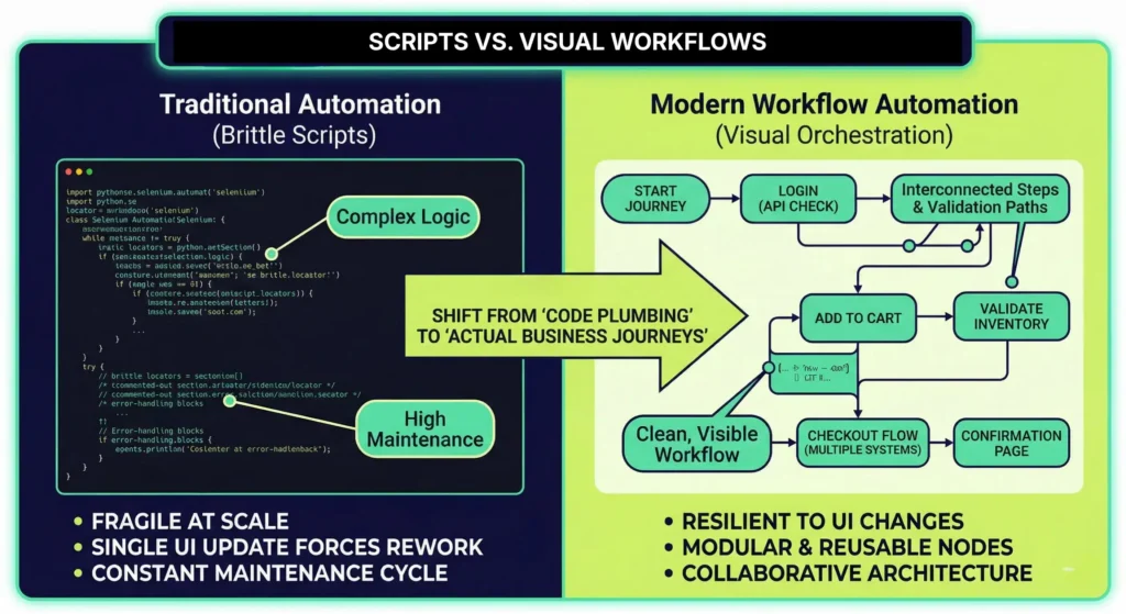 Script-based automation is hitting its scalability ceiling. Visual workflows, AI-assisted maintenance, and orchestration-first design are changing how modern QA is built and managed.