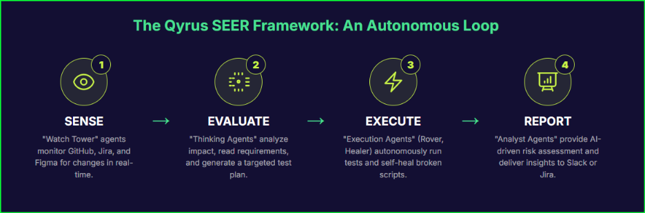 The Qyrus SEER framework provides a definitive architectural answer. It is a purpose-built, vertical solution that deploys a squad of specialized Cognitive Reasoning agents to create a system that is invisible (operates autonomously in the background) and invincible (delivers higher quality, greater coverage, and unwavering confidence).