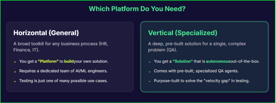The general-purpose platforms just described are horizontal. They provide a broad toolkit to automate any business process, from HR to finance. Software testing is just one of many things they can do, but you must build the specialized testing agents yourself.