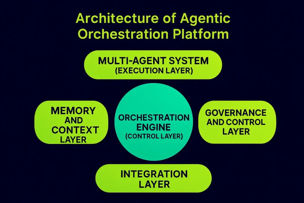 An agentic orchestration platform coordinates autonomous AI agents, systems, and workflows to execute complex tasks like testing without manual intervention. It acts as a policy-driven coordination layer that connects human goals to system-level actions.