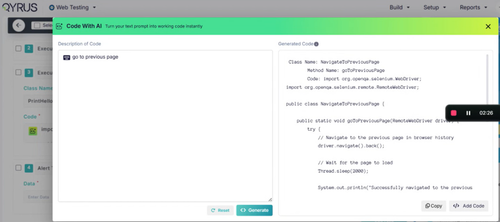 Previously, creating and expanding tests with Qyrus Recorder (formerly known as Encapsulate), while effective, might have involved primarily manual recording processes. Users looking to define tests using natural language descriptions, automatically generate diverse test scenarios from existing ones, or ensure complete exports without manual touch-ups faced limitations.